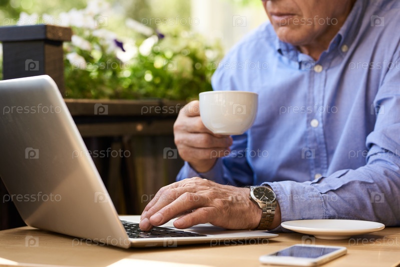 Пожилой мужчина использует ноутбук во время перерыва на кофе