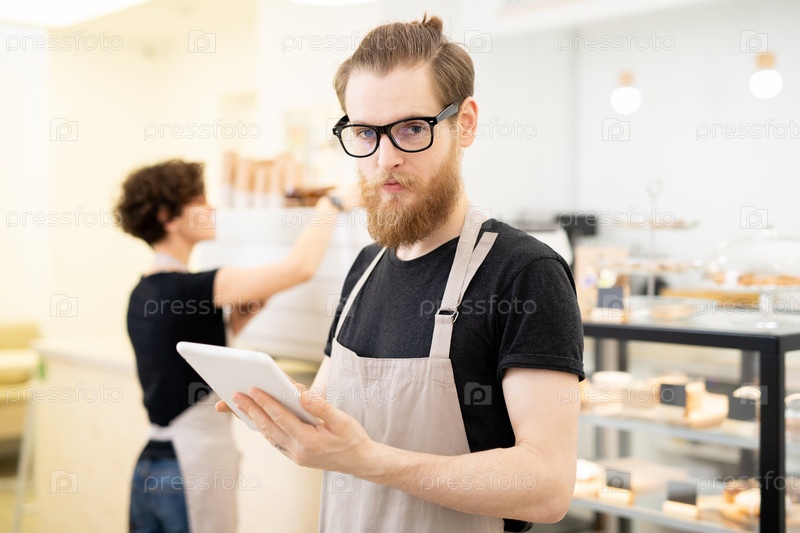 Серьезный хипстер молодой официант в кафе