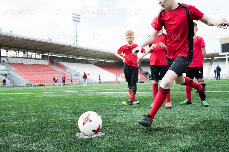 Мальчик, бьющий мяч на футбольной практике