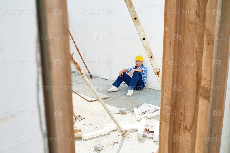 Измученный строительный работник делает перерыв