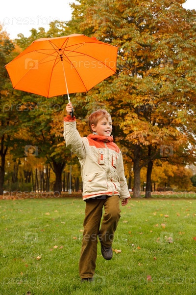 Веселый мальчик в осеннем парке с оранжевым зонтиком над головой