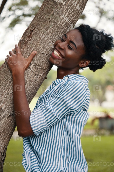Очаровательная чернокожая женщина обнимает дерево