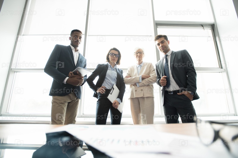 Уверенная мультиэтническая бизнес-команда против окна