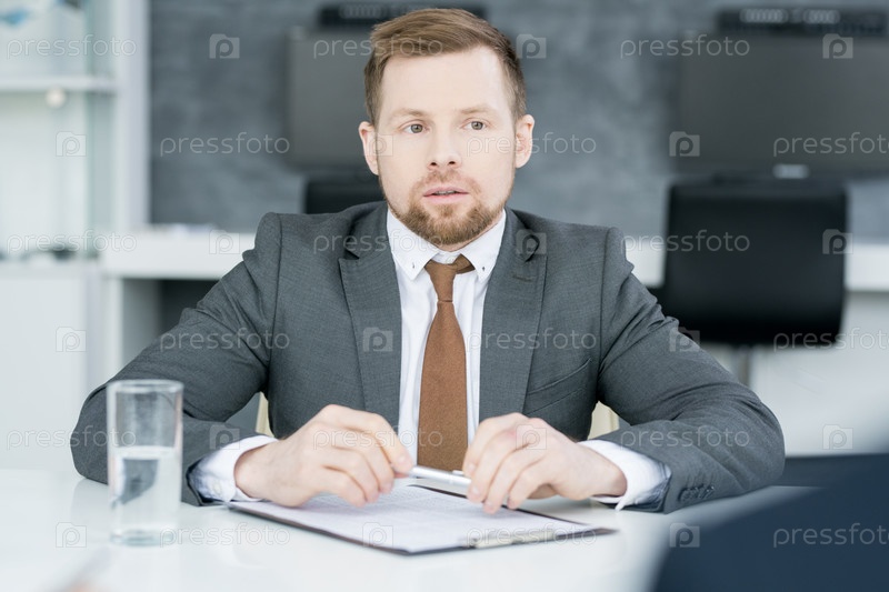 Молодой бизнесмен, слушающий партнеров