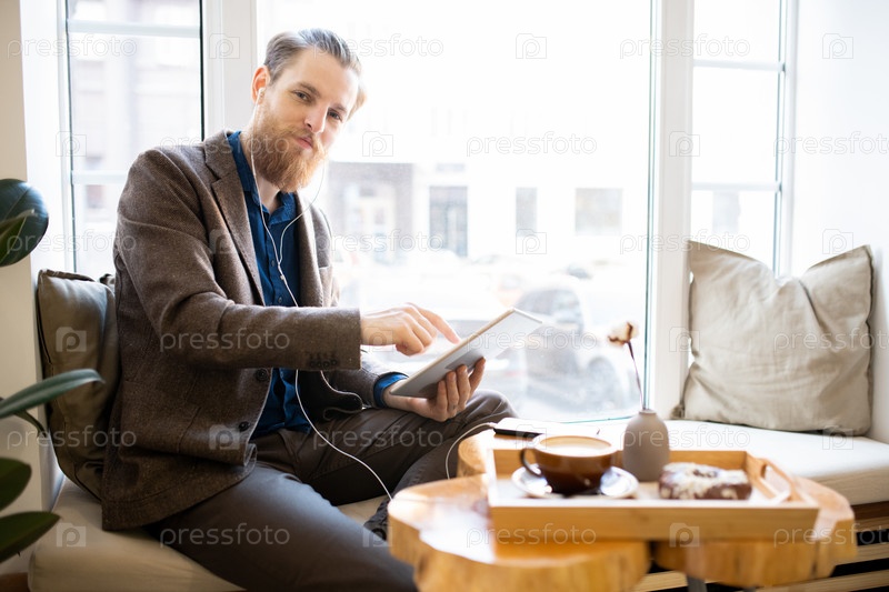 Удовлетворенный хипстер, работающий в кафе