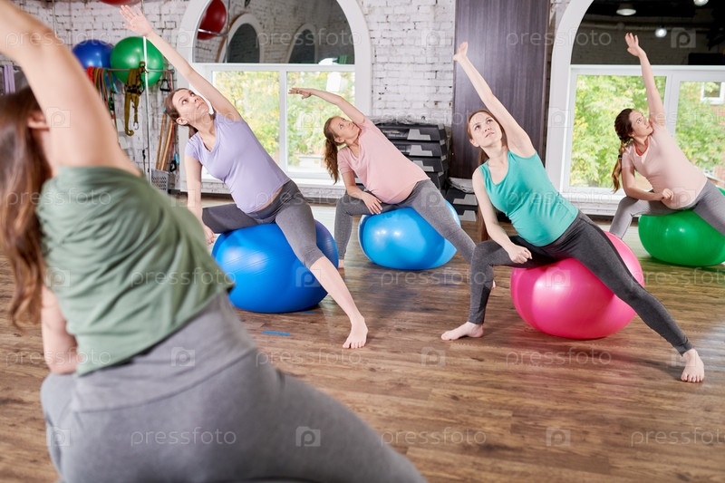 Группа беременных женщин, проделывающих растяжки на фитнес-классе