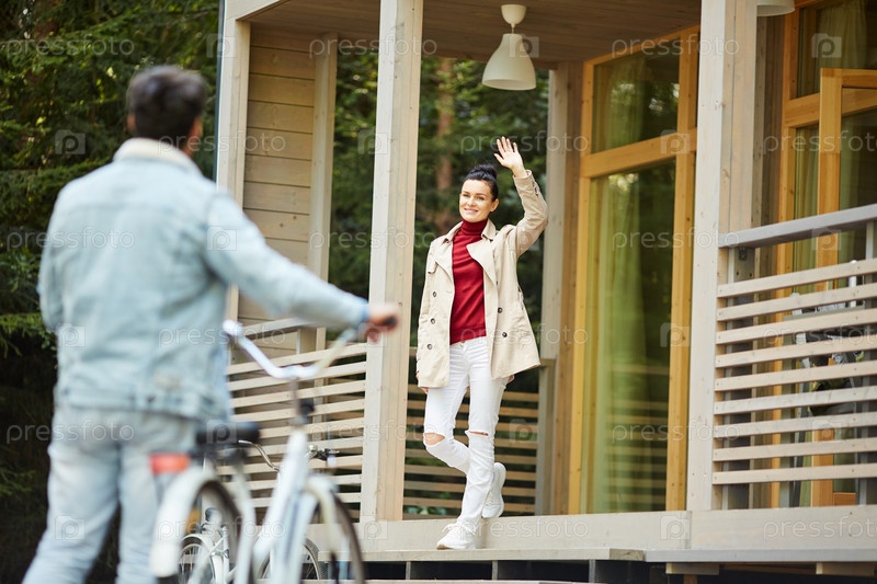 Улыбающаяся леди размахивает рукой своему парню с велосипедом