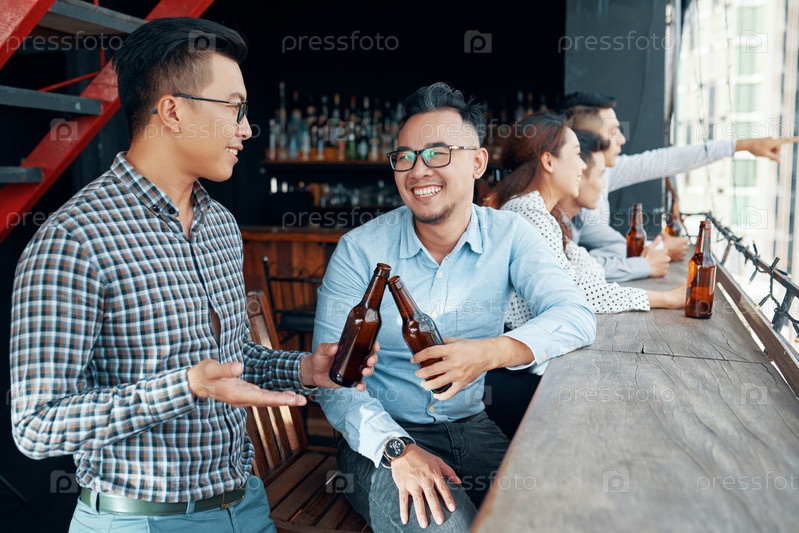 Смеющиеся друзья, скандирующие бутылками пива