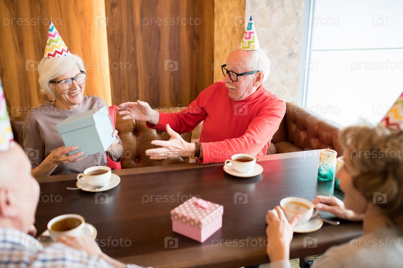 День рождения старшего мужчины, принимающего подарки от друзей