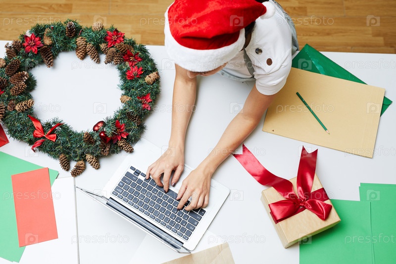 Женщина в шляпе Санты печатает на ноутбуке