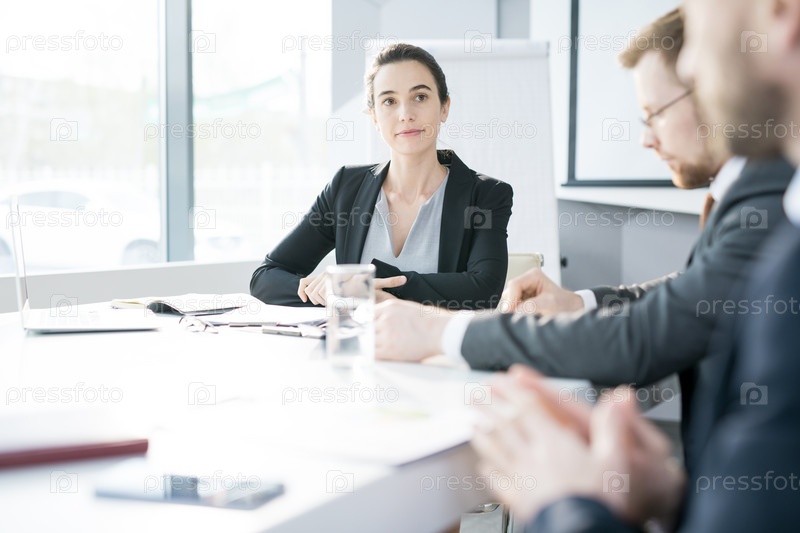 Молодая бизнесвумен слушает на встрече