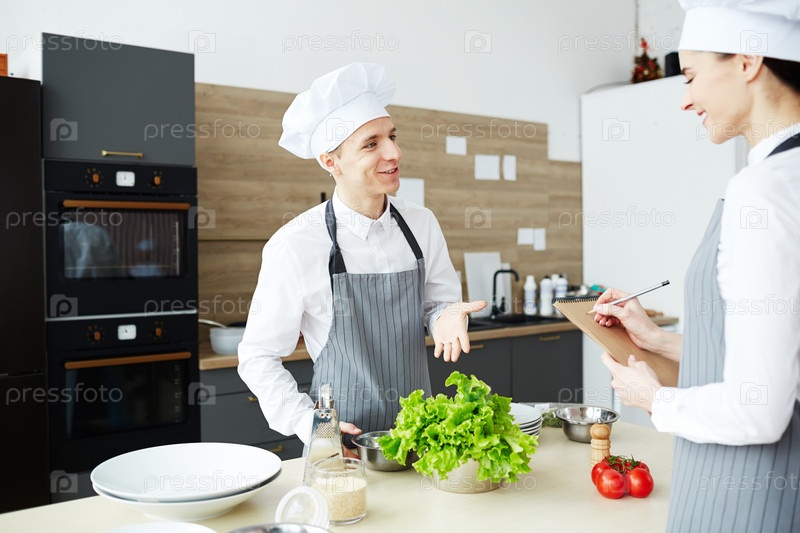 Удовлетворенный человек сдает практический экзамен на уроке кулинарии