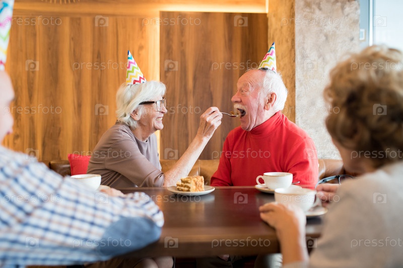 Веселая пожилая леди кормит мужа