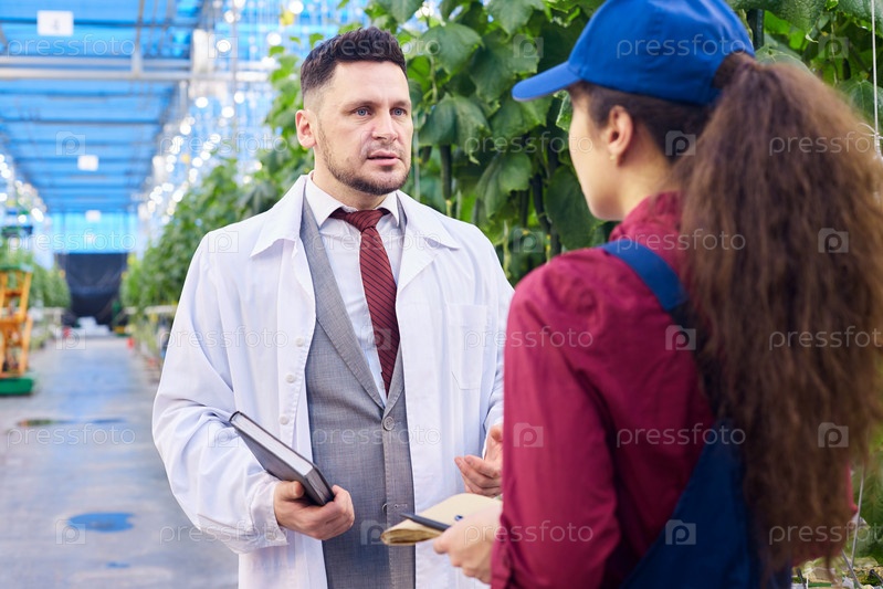 Красивый ученый разговаривает с работником в теплице