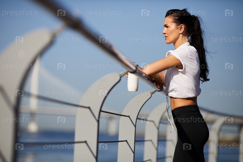 Задумчивая спортсменка, опирающаяся на перила на открытом воздухе