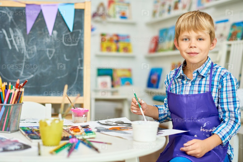 Блондинка-маленький мальчик позирует в художественной студии