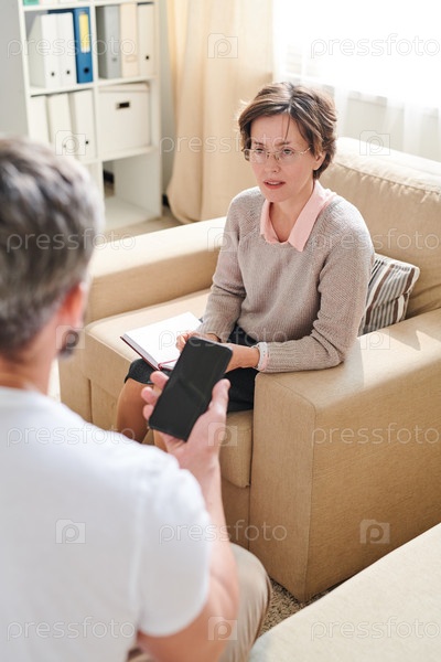 Вдумчивая леди-психиатр слушает пациента во время сеанса