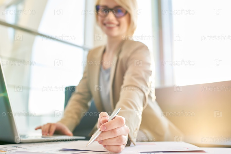Улыбающийся молодой менеджер позирует для фотографии