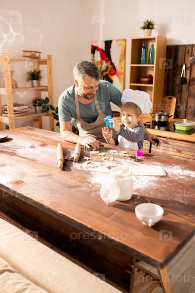 Счастливый мальчик, использующий формы во время приготовления сахарного печенья