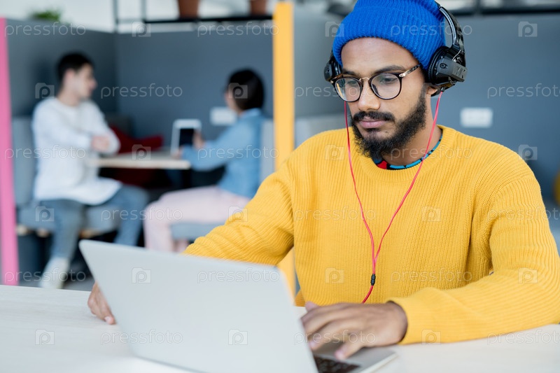 Серьезный ближневосточный мужчина, работающий с ноутбуком