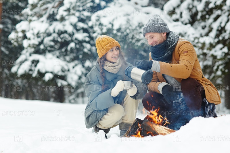 Счастливая пара пьет горячий чай и сидит у костра
