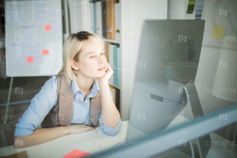 Вдумчивая офисная женщина на работе