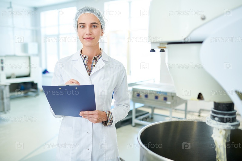 Работник фабрики кондитерских изделий, стоящий с накладкой