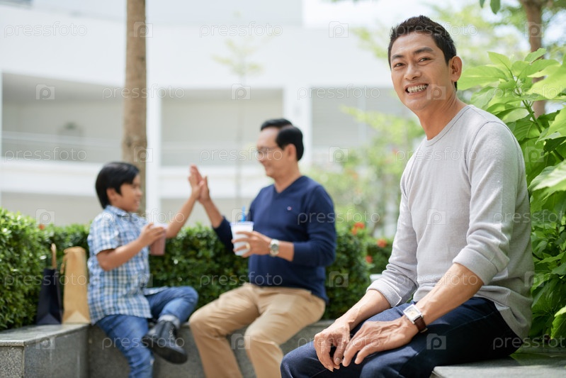 Азиатский мужчина рядом с отцом и сыном в парке