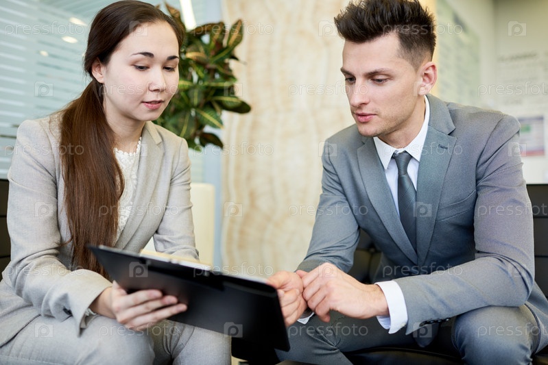 Молодые коллеги, обсуждающие бизнес