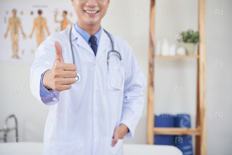 Урожайный врач жестом поднимает большой палец