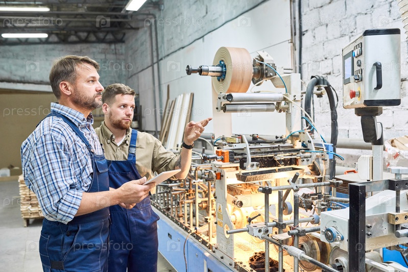 Рабочие, использующие современные машины на фабрике