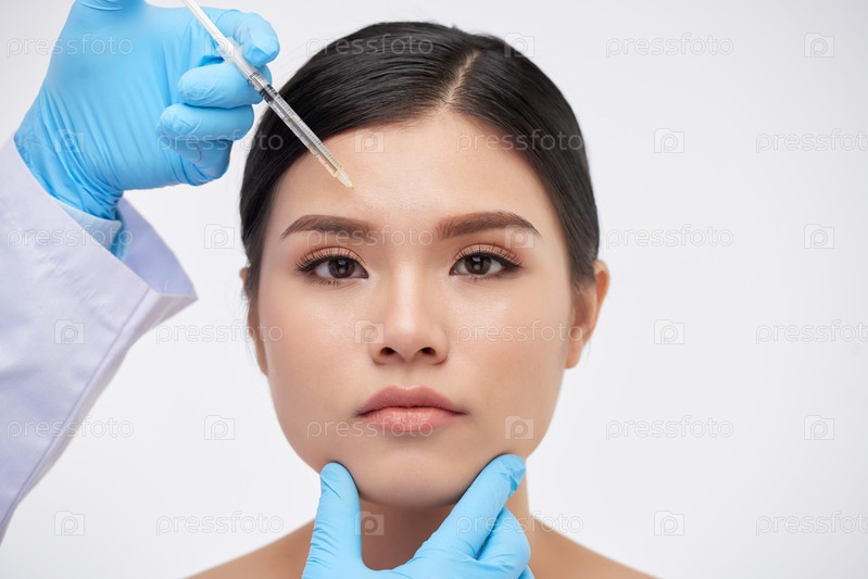 Рука делает инъекцию в лицо женщины