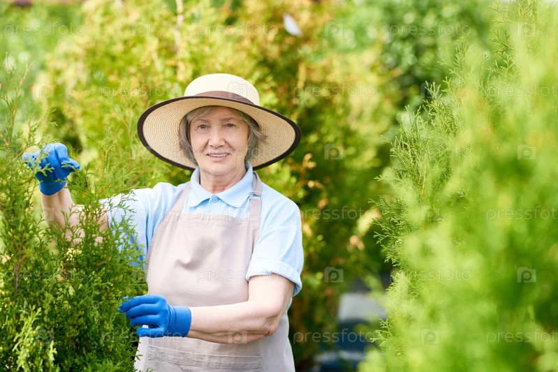 Счастливая старая женщина позирует в саду