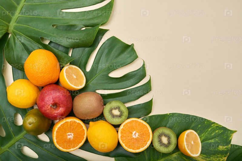 Яркая композиция вкусных фруктов на листьях