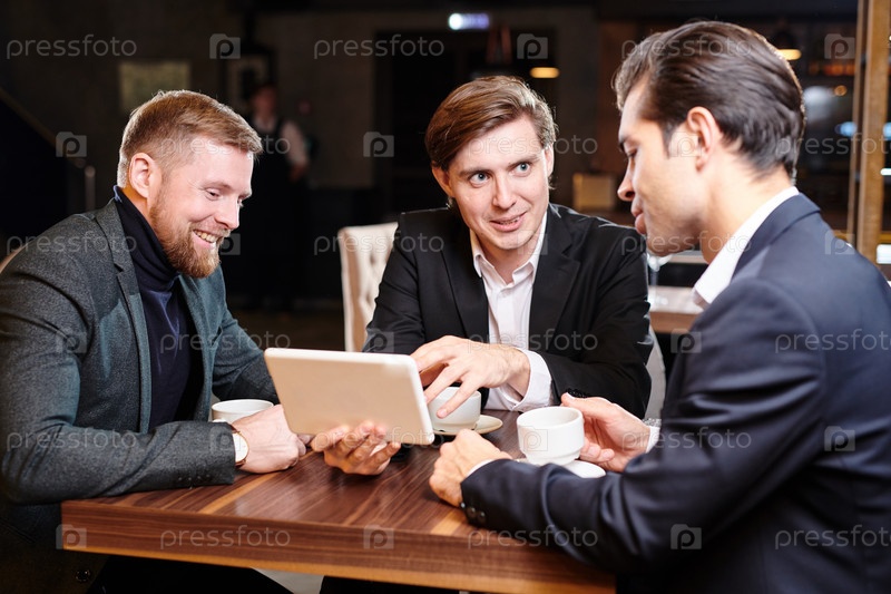Позитивные деловые партнеры обсуждают проект в ресторане