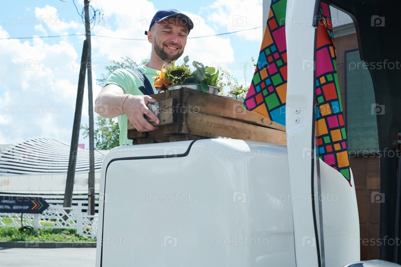 Мужчина держит коробку с цветами в солнечный день