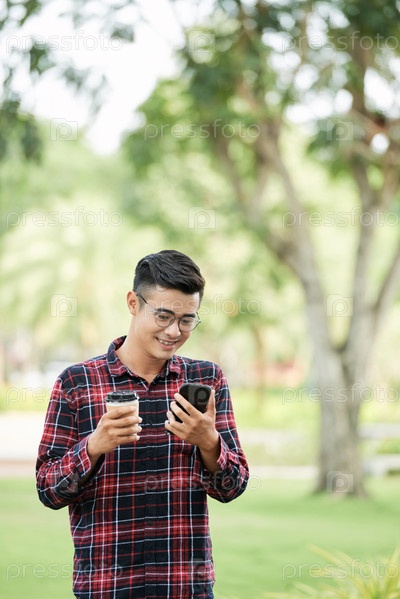 Веселый мужчина с кофе и телефоном