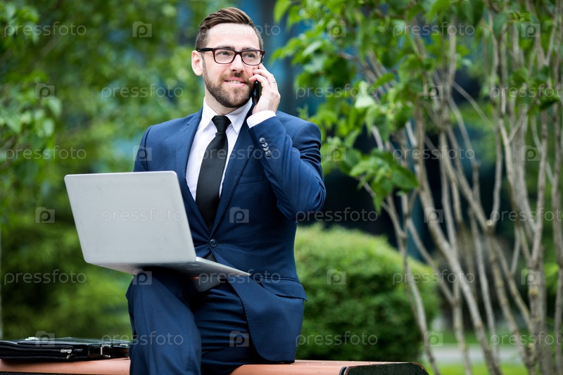 Улыбающийся бизнесмен сидит на скамейке с ноутбуком и смартфоном