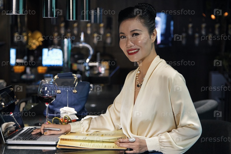 Улыбающаяся деловая женщина, работающая с меню и ноутбуком