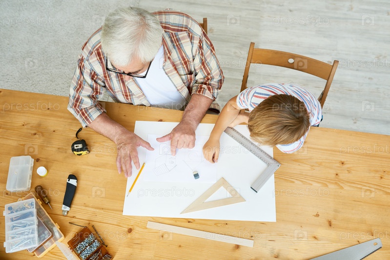 Дедушка и мальчик рисуют эскиз птичьего домика