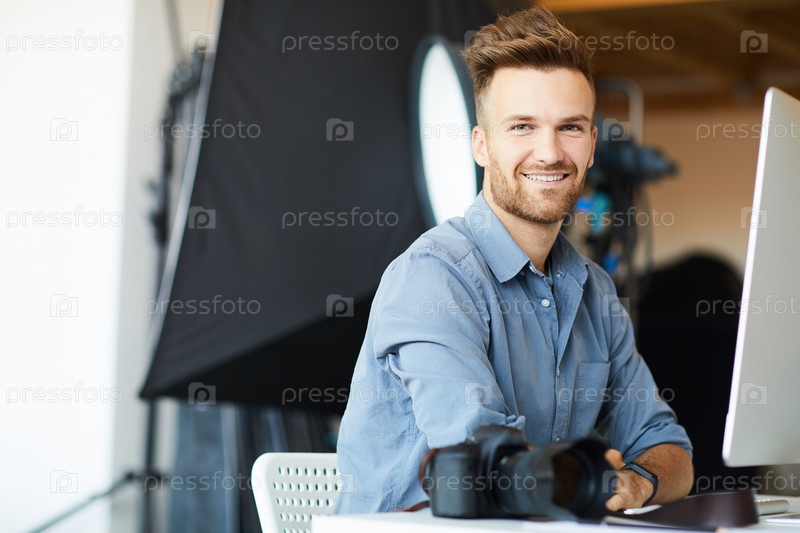 Красивый фотограф, использующий компьютер