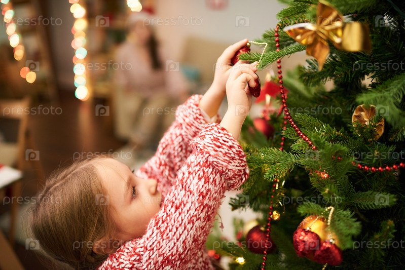 Милая девушка украшает рождественскую елку