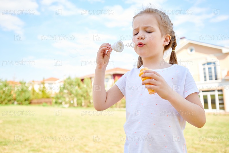 Милая рыжеволосая девушка дует пузыри