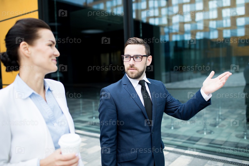 Мужчина в формальном костюме ходит с женщиной и разговаривает