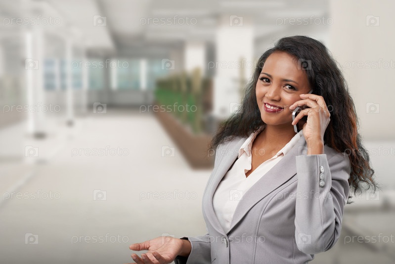 Улыбающаяся бизнесвуменка обсуждает контракт по телефону