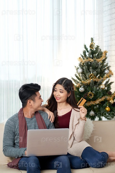 Этническая пара покупает подарки на Рождество через ноутбук