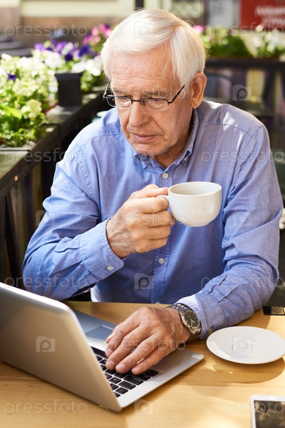 Современный старший мужчина, использующий ноутбук на кофейном перерыве
