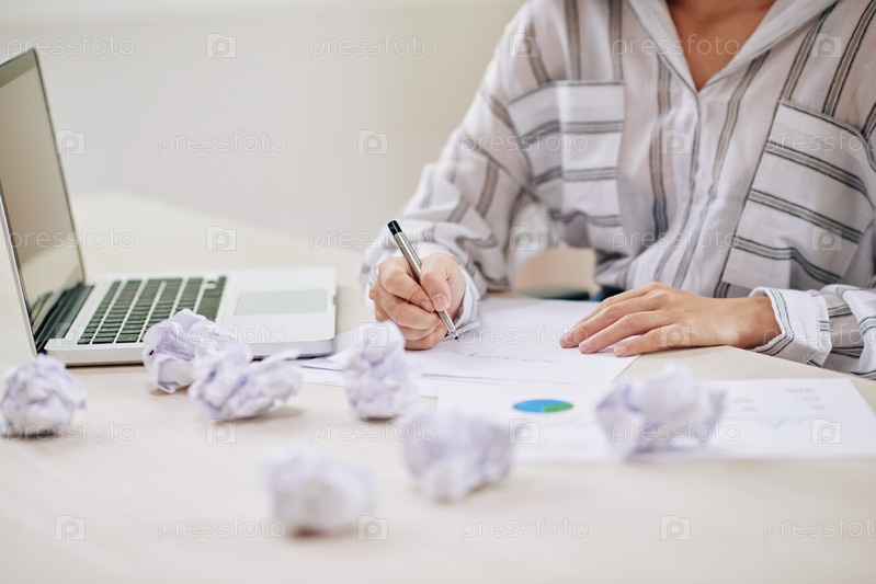 Женщина с ноутбуком пишет на бумаге