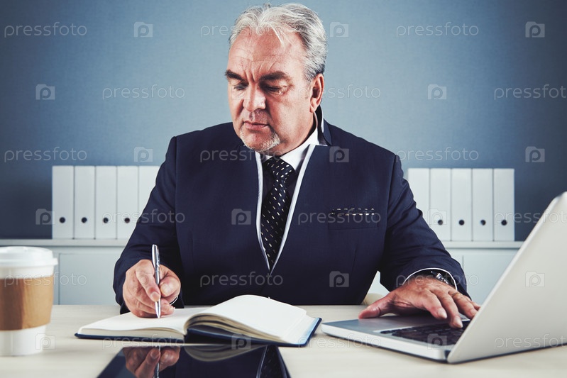 Концентрированный старший бизнесмен, пишущий в блокноте