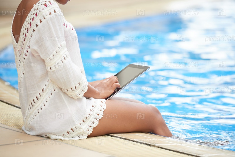 Отдыхая у бассейна с цифровым планшетом